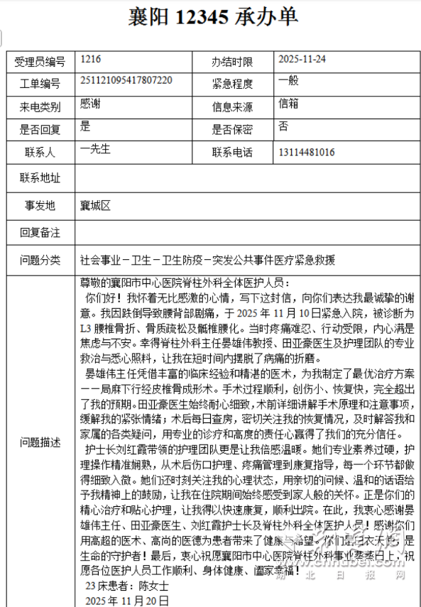 荆楚网(湖北日报网)讯(通讯员 王元婷)近日,襄阳市中心医院脊柱外科收到三封温暖的表扬信:一封来自家属电话转发的感谢信……对医疗团队的赞扬,也体现了该科室医护人员最初“以患者为中心”的愿望。