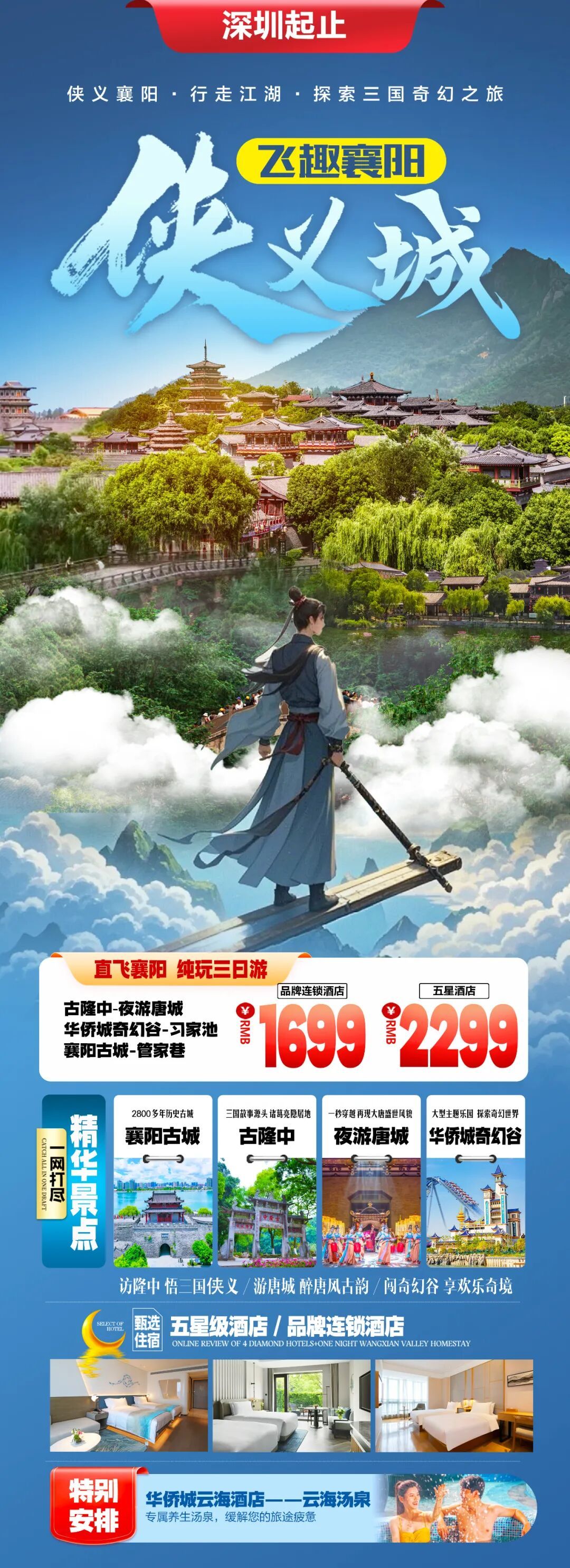 “飞曲·襄阳侠城”自由行产品(三天两夜),旅游景点有古龙中、汤城、梦幻谷、云海汤泉、襄阳古城、西家池。游客从深圳出发到达香珠品牌连锁酒店1699元/人,入住五星级酒店2299元/人;开始g 从广州出发,连锁酒店1699元/人,五星级酒店入住2299元/人;从杭州出发,香渚品牌连锁酒店1699元/人,入住五星级酒店2299元/人;从昆明出发,连锁酒店2299元/人,五星级酒店2799元/人。